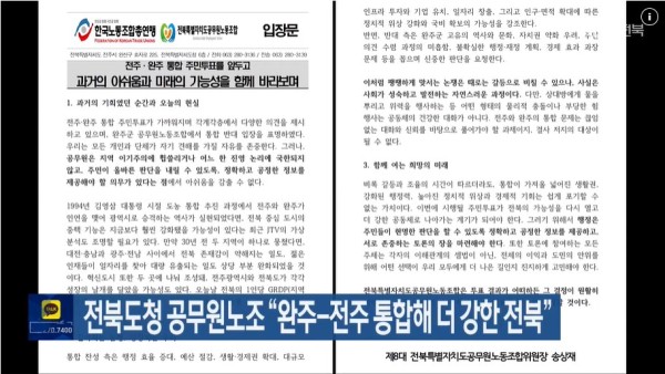 지난 7일, 완주군 공무원 노조가 완주-전주 통합에 반대 입장문을 낸 가운데, 오늘(12) 전북도청 공무원 노조는 사실상 통합을 지지하는 입장문을 발표했습니다.