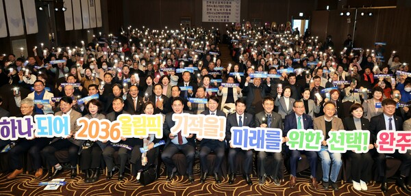 참석자들은 통합에 대한 열망을 담아 ‘완주·전주 하나되어 2036 올림픽 기적을!’ 등의 응원 문구가 인쇄된 핸드 피켓 퍼포먼스로 열기를 더했다.