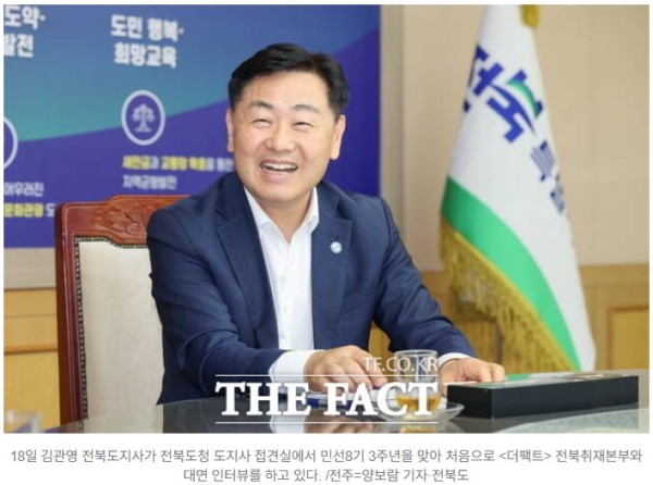 민선8기 3주년을 맞아 처음으로 <더팩트> 전북취재본부의 대면 인터뷰에 응한 김 지사의 말 한마디, 한마디엔 조심스러움이 느껴졌지만, 도정 현안에는 단호하고 힘이 있었다.