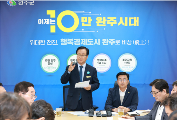 유 군수는 “신규 주거단지 조성 등 정주여건 개선, 적극적인 기업 유치를 통한 양질의 일자리 창출, 아이 낳고 양육하기 좋은 환경 조성 등을 통해 10만 완주시대를 개막했다”며 “이러한 기세를 몰아 올해 안에 전북 4대 도시로 도약하겠다”고 말했다.