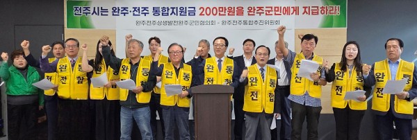 완주·전주통합추진위원회와 완주·전주상생발전네트워크는 15일 전주시청에서 기자회견을 열고 "통합지원금은 경제를 살리는 재정 투자이자 상실감을 해소하는 복지 투자"라며 "전주시와 전주시의회에 완주군민 지원금 지급을 건의한다"고 밝혔다.